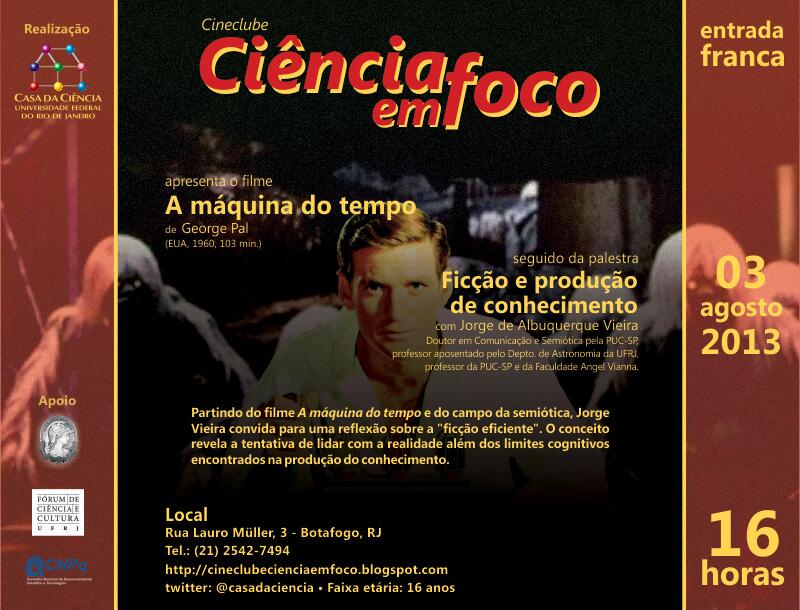 Ciência em Foco, no primeiro sábado de agosto, apresenta A máquina do Tempo, filme de George Pal, seguido da palestra “Ficção e produção de conhecimento”, com Jorge de Albuquerque Vieira, Doutor em Comunicação e Semiótica pela PUC-SP, professor aposentado pelo Departamento de Astronomia da UFRJ, professor da PUC-SP e da Faculdade Angel Vianna.